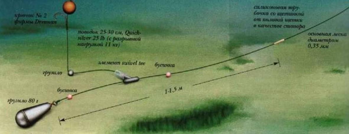 Карп, взявший приманку, засекается сам, поскольку стопор фиксирует поводок, а рыба при попытке к бегству начинает вытаскивать грузило из слоя ила. В водоемах с мягким грунтом эта оснастка работает великолепно, а так как здесь карпа ловят редко, у него вряд ли есть горький опыт общения с крючком.