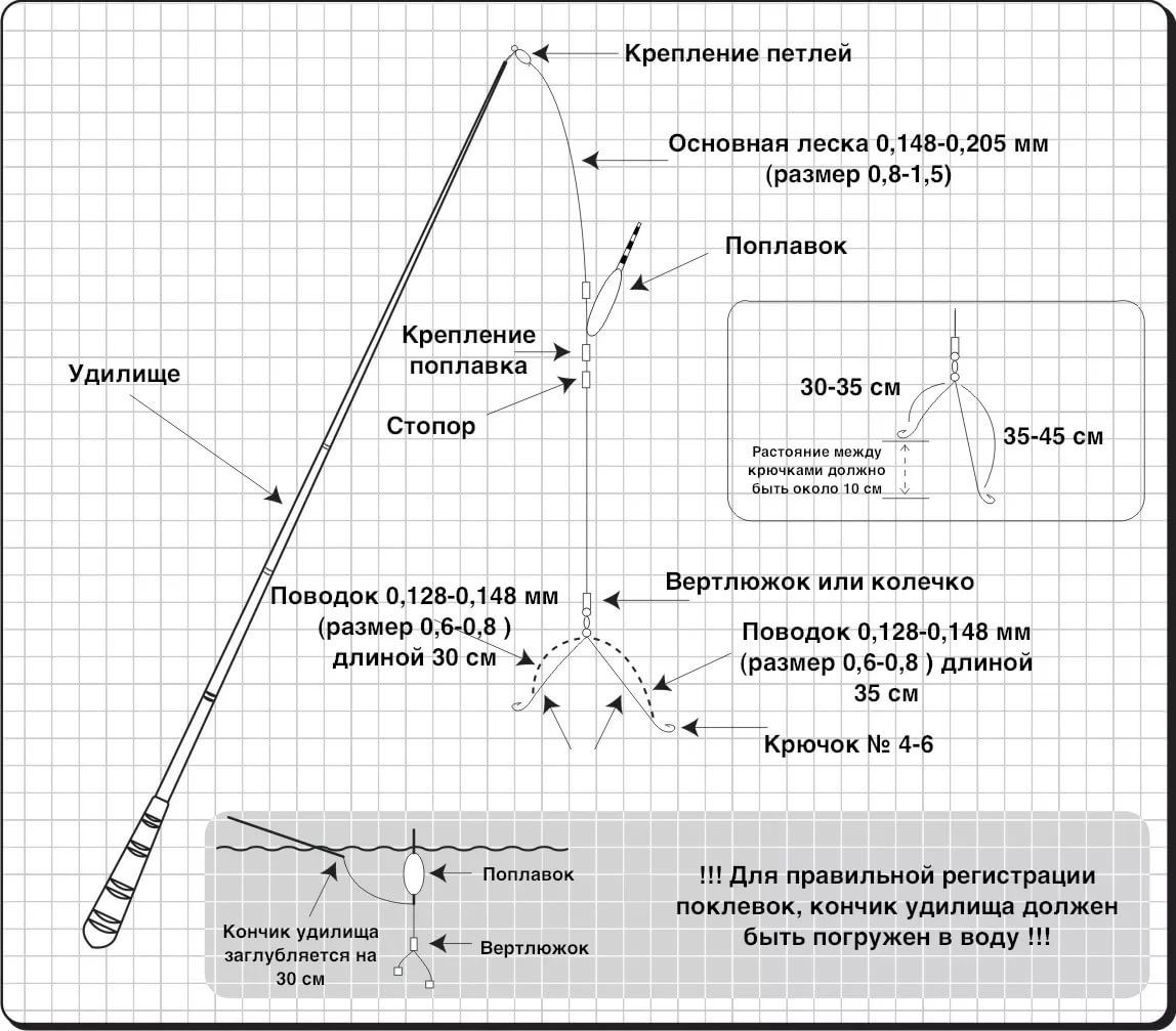 Здесь большую роль играет поплавок. Также потребуется груз и вертлюжок, два отдельных поводка с крючками. Особенность ловли заключается в применении особой насадки, состоящей из особого теста, которое насаживается на крючки в виде шариков.