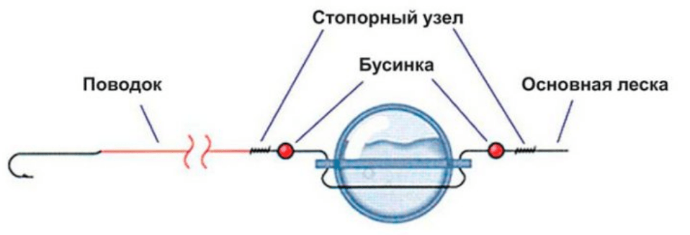К другому ушку поплавка способом «петля в петлю» прикрепляется поводок. Толщина поводковой лески должна быть небольшой: от 0.14-0.18, ведь в основном такую снасть применяют для ловли не больших по размеру рыб. В зависимости от величины рыбы, длину поводков подбирайте от 0.5 до 1.5 м.
