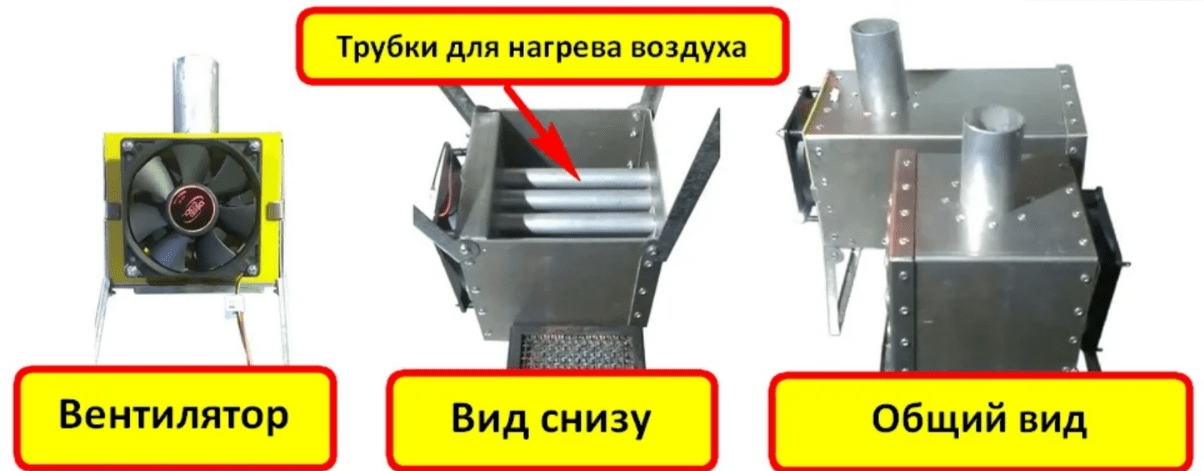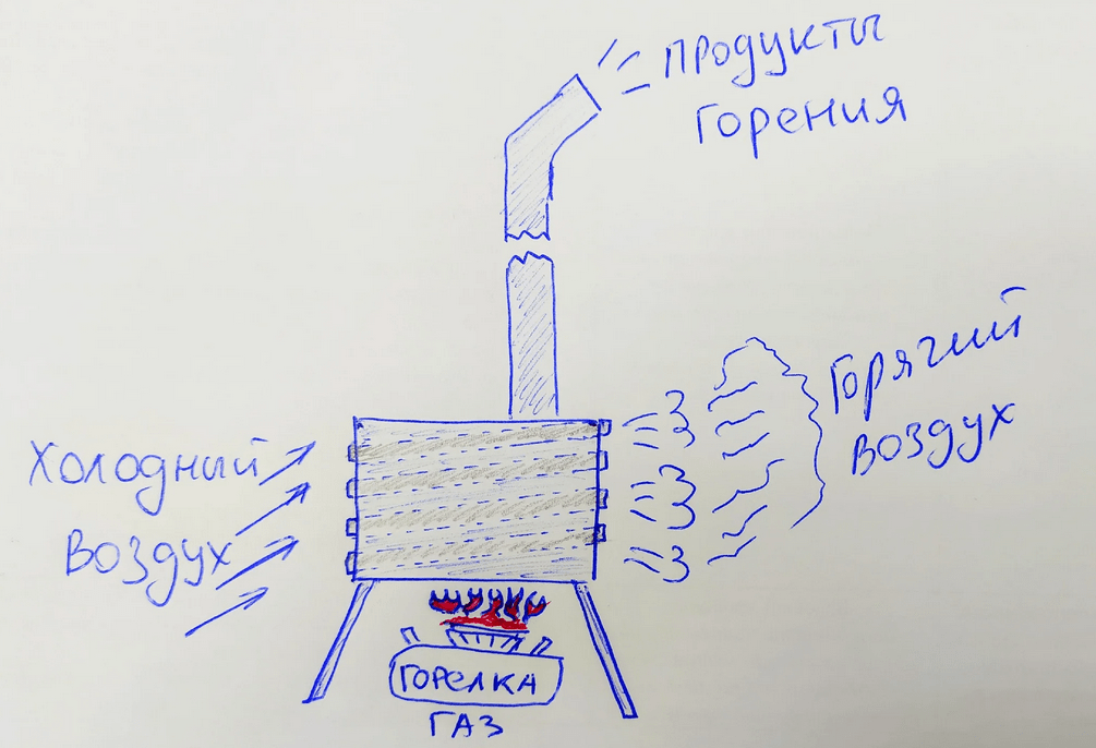 Принцип прост. Под теплообменник ставится газовая горелка. Огонь нагревает трубки в которых разогревается воздух и выходит с противоположной стороны теплообменника. Трубки стоят под углом и происходит процесс конвекции — холодный воздух засасывается, горячий воздух выходит. Продукты сгорания вылетают в трубу. Вроде все просто и безопасно. Иногда еще стоит вентилятор для большего эффекта.