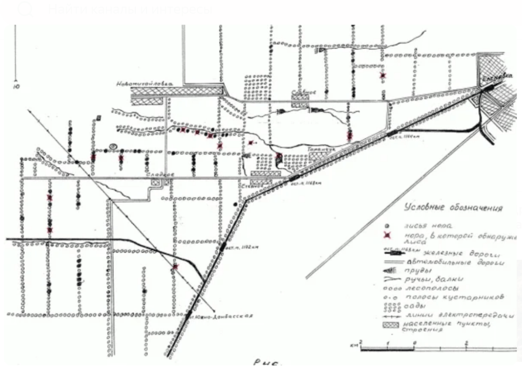 Попутно я фиксировал характер нор (количество отнорков, заброшенная или посещаемая, особенности расположения отнорков и т. п.) и учитывал обнаруженных и добытых лис. Это всё оказалось весьма полезным в процессе охоты. Кроме того, изучая теперь схему и анализируя результаты охоты, можно сделать некоторые интересные выводы и обобщения.