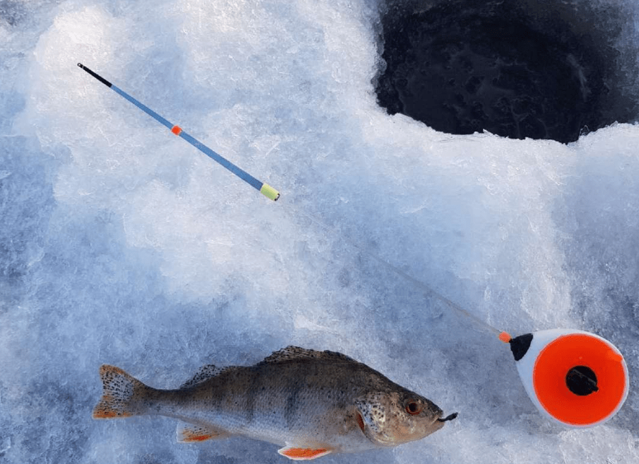Холодный ветер мешал рыбалке, и я снова ушёл под берег. Пробурил лунку на глубине, не превышающей метр. Опустил мормышку и стал играть. Сначала пробовал плавный подъём, затем перешёл на активную игру. И тут кивок загнуло. Приятная тяжесть на другом конце лески дала понять, что рыба сидит крупная, но сопротивлялась она не сильно. Вскоре из лунки показался красавец окунь приятного размера. Изо рта его торчала тюлька.