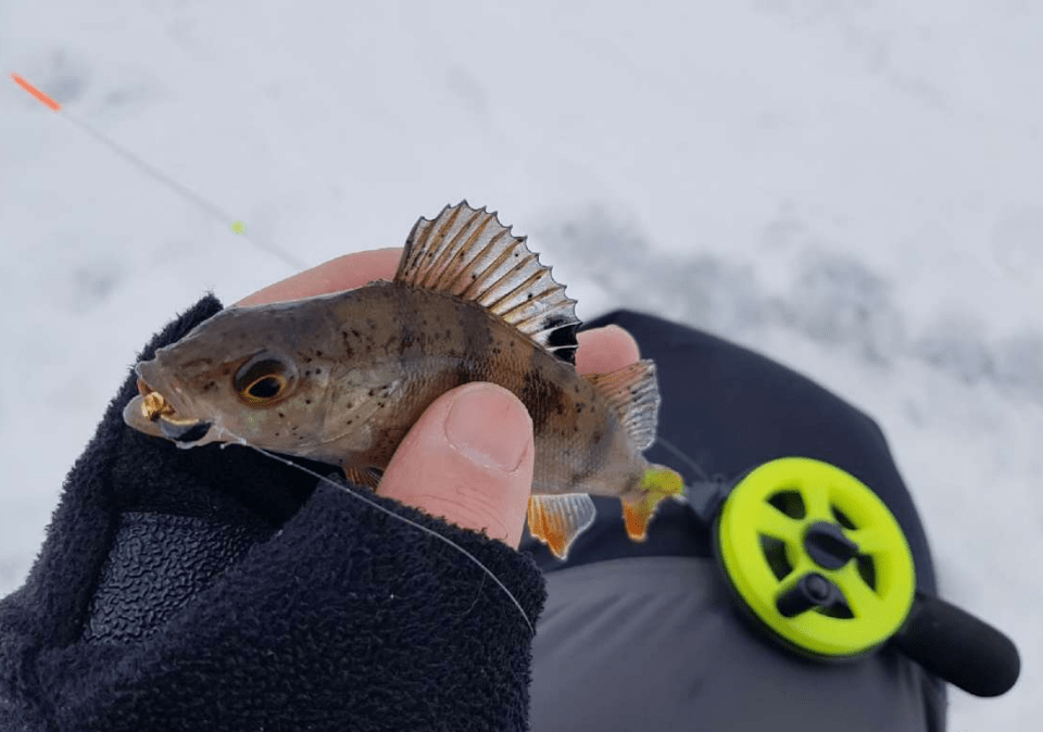 Рыбаков на льду было много, несмотря на то что неделя рабочая. Почти все активно перемещались по льду в поисках поклёвок. Вот и я решил погулять, погреться. Перешёл на другую точку с небольшим течением, сел на перспективной точке и поймал небольшого окунишку. На часах был час дня, а этот окунь у меня стал первой рыбой, пойманной за день. Начало положено!