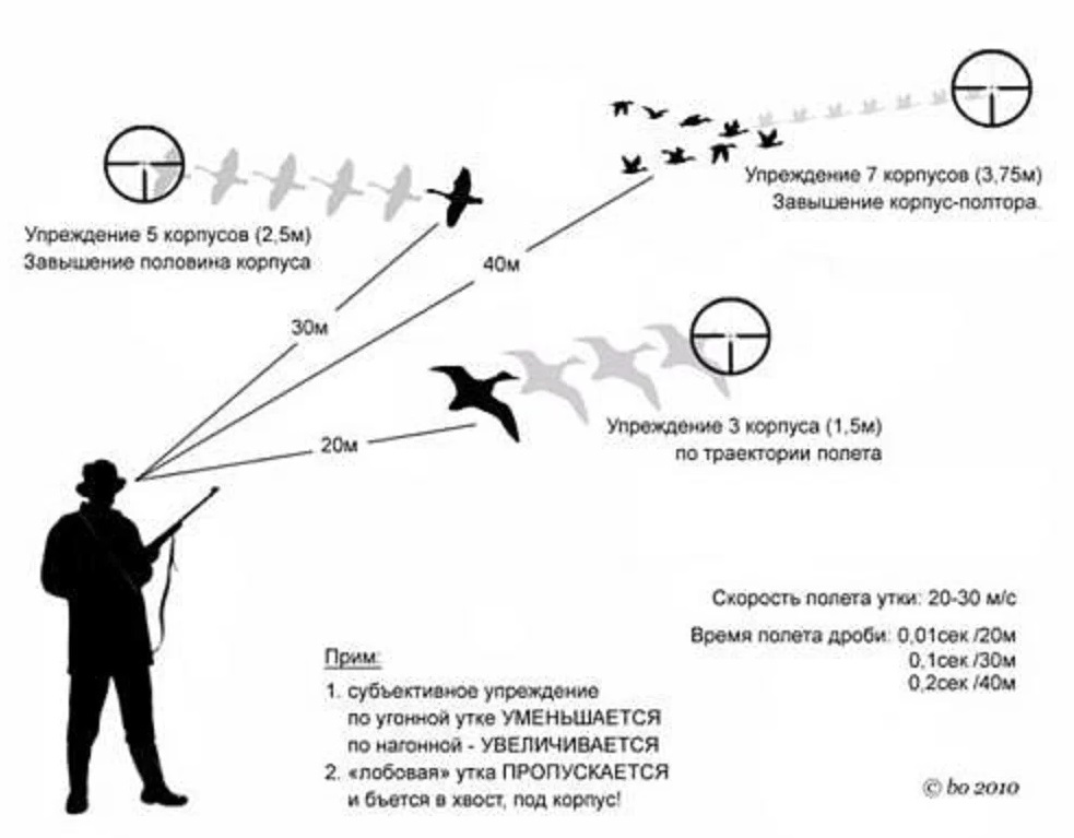 Во-первых, конечно надо понимать, что делать остановку ружья при поводке недопустимо. Так как на дистанции сорок метров за полсекунды утка пролетает 10-15 м. Соответственно, если вы остановитесь и выстрелите, то это будет всё равно что стрелять просто в небо.