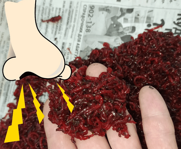 Покупая в магазине мотыль я делаю смешную с виду, но эффективную манипуляцию. Я просто беру щепотку мотыля и нюхаю его.