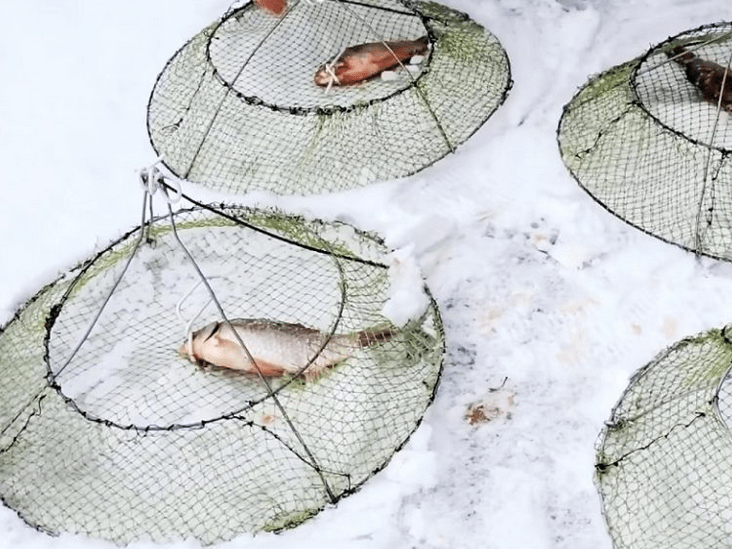Раколовки в это время используются самые простые, поскольку погрузить под лёд многокамерную ловушку или вершу нет возможности. Наиболее удобными являются ловушки с двумя обручами. Это открытые раколовки, которыми результативно ловят и летом. Но чтобы не рубить большие полыньи, можно два обруча раколовки не фиксировать, а делать их подвижными и складывающимися.