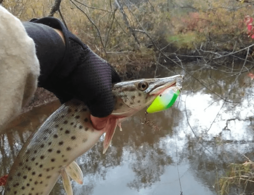 Большей частью это щука в районе килограмма с редкими, но довольно регулярными поклевками особей в 2-3кг. Плюс неплохой окунь, и много голавлей бывает в корчах – на участках речек, где эта рыба водится массово.