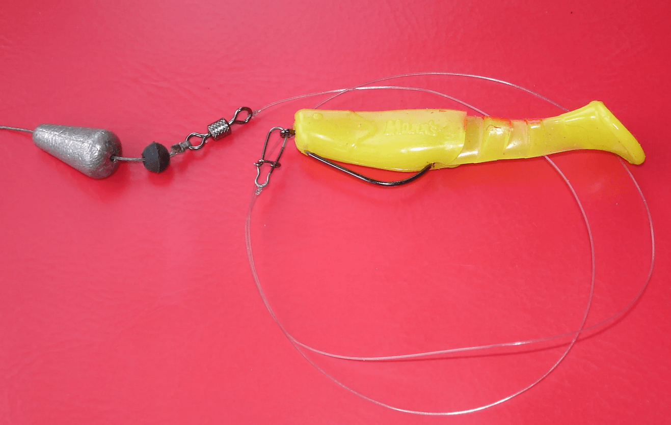 - Последний делается длинным (до 1,50 м) и оснащается чаще небольшими виброхвостами, твистерами. Такой монтаж позволяет приманке «парить» в толще воды, что сказывается на добычливости снасти.