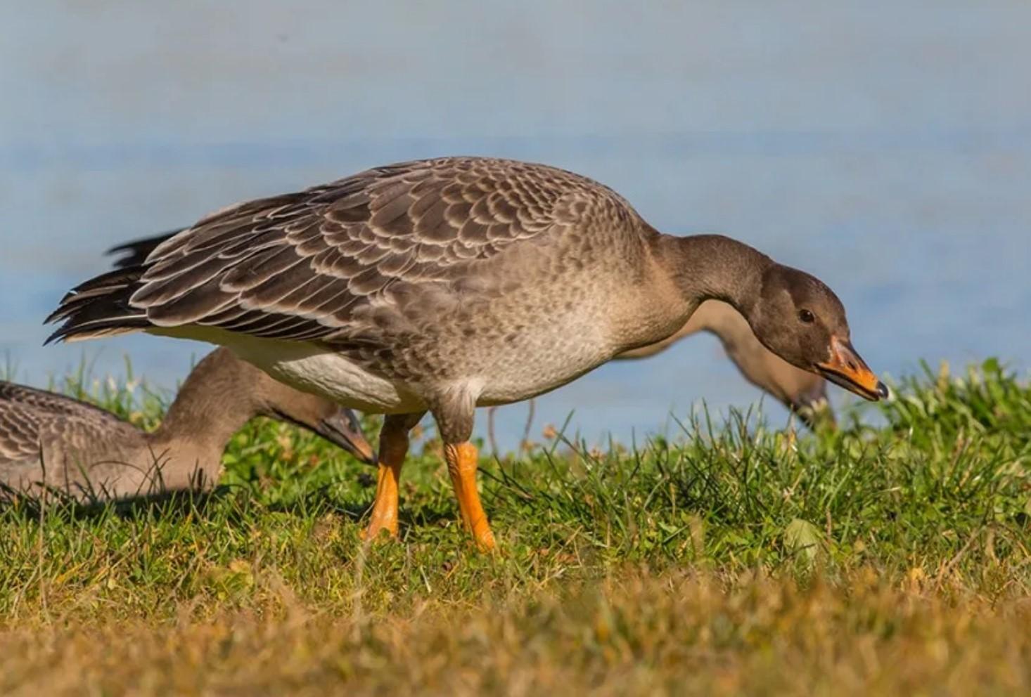 Очень схож с серым видом. С несколькими отличительными чертами. Окрас перьев тоже бурого цвета с добавлением серого оттенка в своем большинстве, светлой шеей и грудью. Но клювы гуменников – темные с оранжевыми вставками по середине. Именно по ним охотники и отличают их от серых гусей.