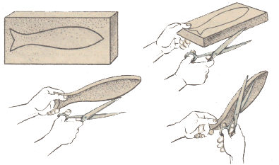 Смочить поролон в воде и хорошенько отжать, тем самым снимается с материала статистический заряд. Затем при помощи обычного лезвия отрезается прямоугольная заготовка необходимого размера и разрезается вдоль по диагонали на две части.