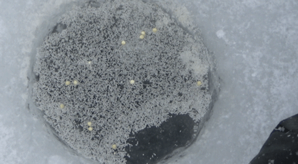 Во время ужения время от времени подсыпаем несколько щепоток прикорма в лунку. О наиболее удобной ёмкости для прикорма ниже в статье.