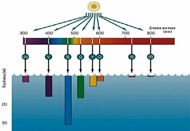 Да вы правильно поняли, на инфо графики схематично показано проникновение в воду лучей того или иного спектра, на ней видно, что глубже всех проникают, лучи синего и голубого спектров, красный хуже всего и далее по нарастающей, оранжевый, желтый, зеленый, голубой синий, и вдруг резкое ухудшение, у фиолетовой и совсем уже плохо, у ультрафиолета.