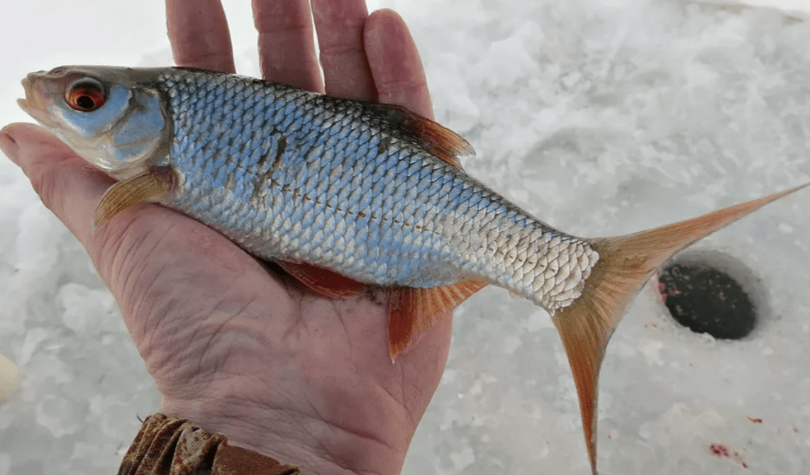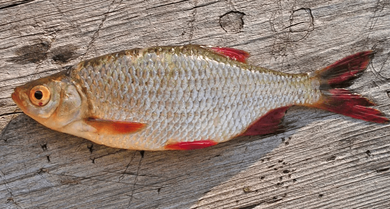 Краснопёрка (она же красноглазка или сорога) — внешне очень похожа на плотву. Самые главные отличия золотистый цвет чешуи и огненно-красные плавники. Так же краснопёрка имеет оранжевый цвет глаз с красным пятном вверху, а у плотвы глаза кроваво-красные.