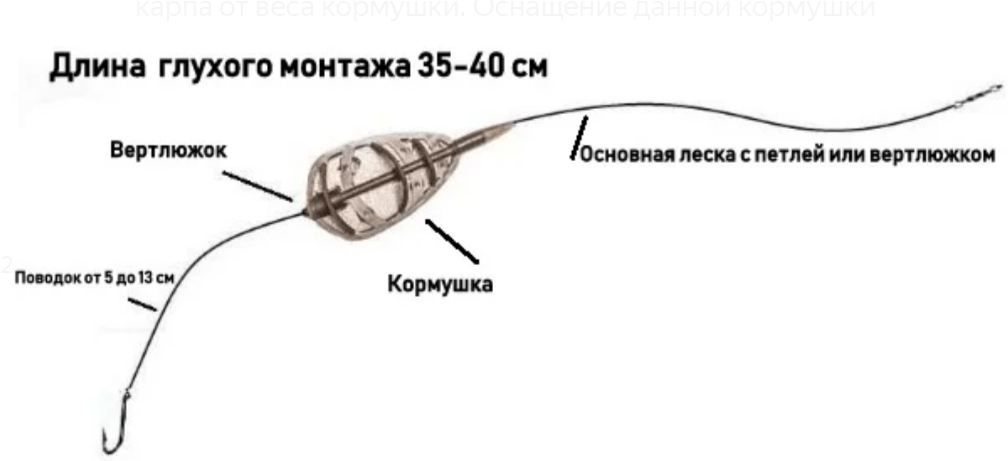 Снасть делается очень просто, для новичка я посоветую не делать «скользячку», а собирать снасть «глухую» для самозасечки карпа. Груз кормушки подбирайте в зависимости от дна. Если дно твердое то кормушку лучше ставить потяжелее. Это способствует самозасечке карпа от веса кормушки. Оснащение данной кормушки для новичка будет самым оптимальным вот такого вида:
