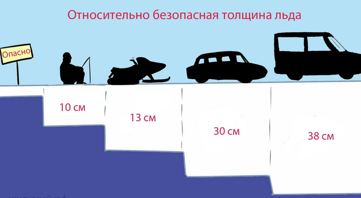 Безопасная толщина льда для ходьбы — 10 см в пресной воде и 15 см в соленой. При такой толщине льда не стоит выходить в устье и протоках рек. В таких местах лед слабее за счет своей структуры и лучше подождать, когда он окрепнет сильнее. Также важный момент — даже если лед более 10 см, но на улице стоит температура выше нуля, то лед ослабевает на 20-30%.