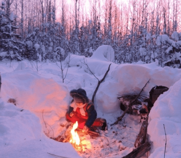 Поэтому, чтобы обогреться, спрятаться от ветра и немного поспать мы вырыли в большом сугробе яму в виде пенала. Воткнули в твёрдый снег по бокам поперечины из жердей, на них тоже положили жерди и лапник. Получились нары. Перед нарами развели костёр, а сверху яму накрыли полиэтиленом, оставив выход для дыма. Вышло тёплое и просторное жильё.