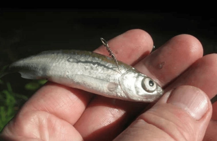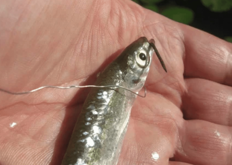 Для того, чтобы крупный налим надёжно схватил живца, рыбку лучше насаживать не под спинной плавник, что нередко приводит к срыву живца и сходу хищника, а, пропуская поводок под одной из жаберной крышек и выводя крючок в рот живца. На снимке показан этот способ с применением самодельного финского крючка.
