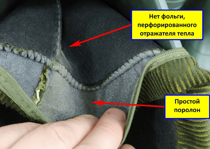 Но вот интересно, если сравнивать сапоги примерно по одной цене — то у Польских и Латвийских дорогих сапог, вкладыш оказался тоньше. А у Lemigo до -30 градусов он не только тоньше, но и не фольгированный. Что еще не понравилось — это простой поролончик на манжете вместо нормального утеплителя. Вывод очевиден -10 градусов для этих сапог предел комфорта.
