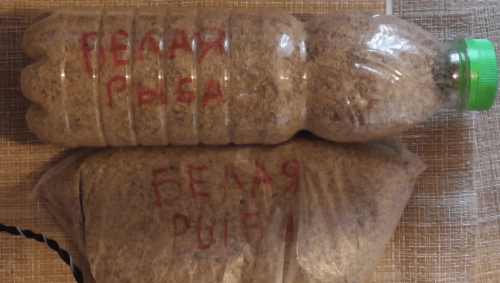 Перемешиваю и в пакетик, эту часть я перед рыбалкой буду увлажнять, а то что в бутылке подсыпать в лунку с верху. Подписываю и жду выходных.