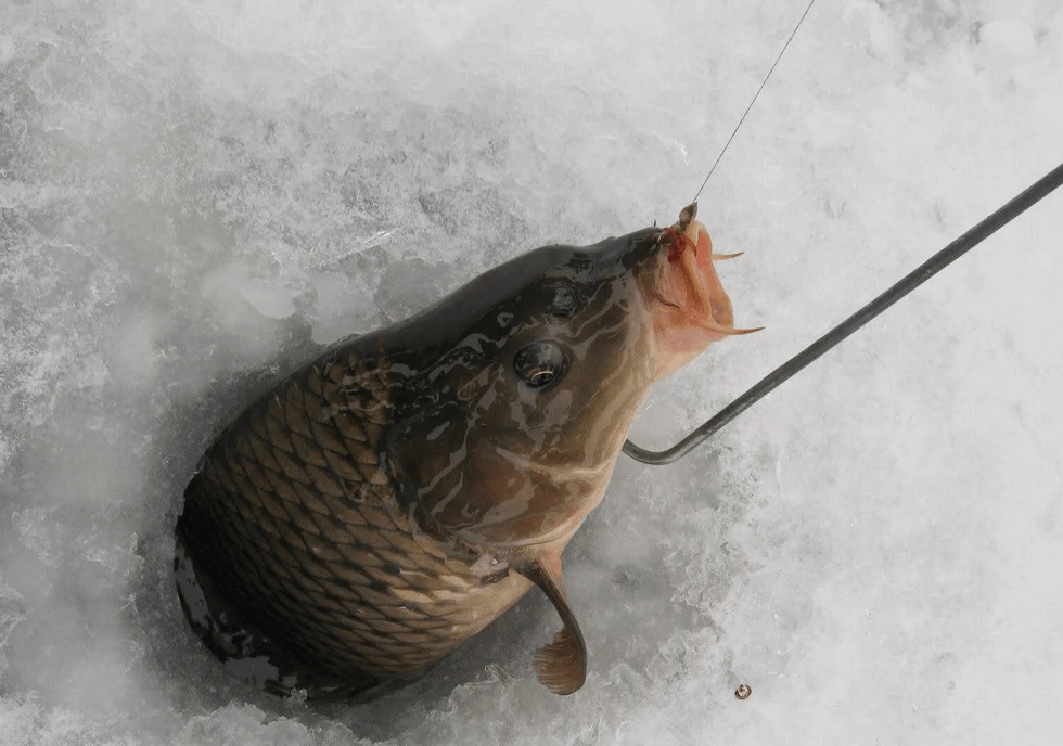 Для вытаскивания крупной рыбы в лунку воспользуйтесь небольшим багориком. Не делайте этого руками.